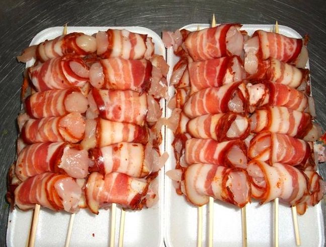 Brochetas: (panceta con pollo y pollo al ajillo con calabacín y pimiento)